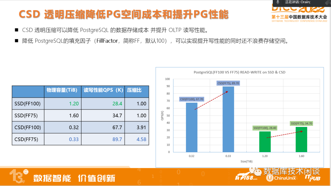 此外,PG还有个空间换性能的设计,它可以跟 CSD透明压缩完美结合,即降低建表时的填充因子来提升数据库更新的性能 同时又不会浪费空间。我们看图,图中箭头方向就是降低填充因子后在CSD盘和SSD标盘上引起空间和性能变化。可以看出作用于同样规模的数据表,填充因子降低25%,CSD上的PG性能提升约28%左右,代价是数据NAND容量仅增加 0.01TiB,约3%。而SSD标盘上性能提升约25% 左右,代价就是空间增加 0.3TiB,约33%。