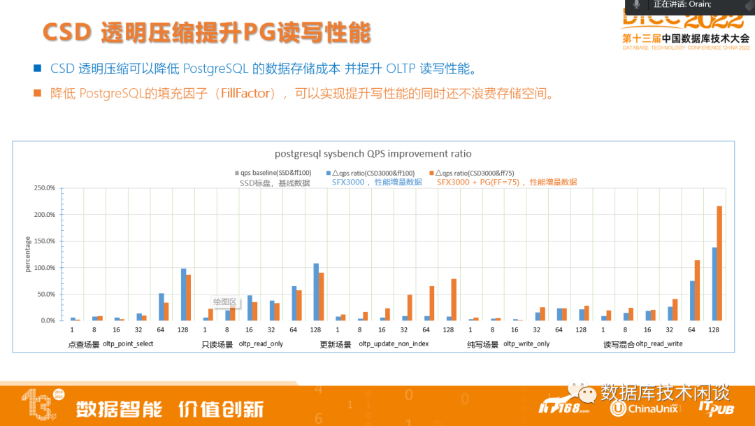 先看蓝色的数据,PG在SFX3000上性能在不同场景下会有10%~125%的性能提升。再看橙色的数据,当降低PG填充因子时,数据库读性能会略有下降,写更新的性能会有个明显的提升,相比标盘提升水平在 25%~ 210%左右。