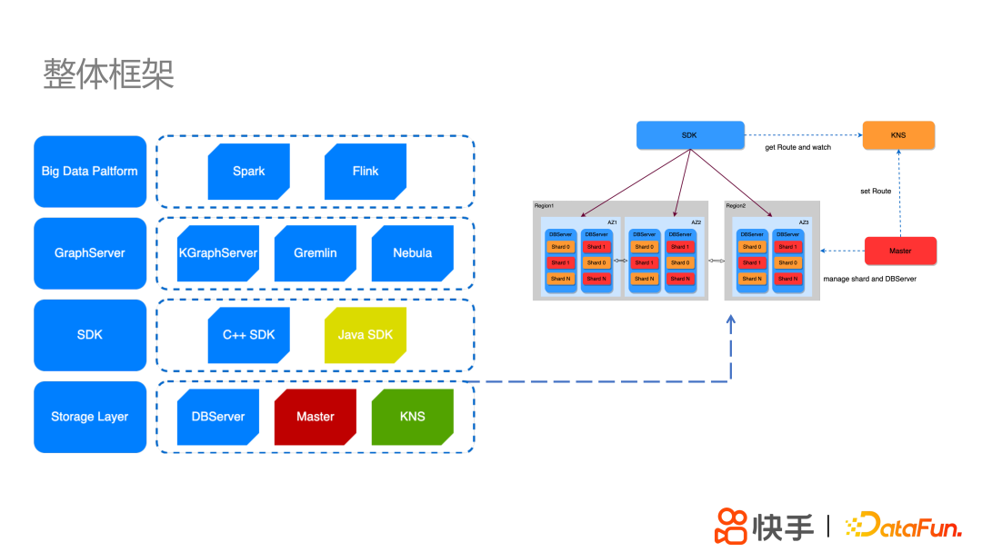 目前图数据库依赖的底层存储主要分为两种,一种是原生的图存储,另外一种是依赖于已有的 K-V 存储或者关系型存储。二者各有优缺,原生的存储可以对图模型进行专门的优化可以更好的提升读写性能;依赖已有模型的优势是已有的存储模型较为成熟,KGraph 则在底层存储上选择了后者。KGraph 的存储层是一个自研的分布式 K-V 存储,主要包含三个角色。首先是 DBServer,采用单进程多 Shard 的设计来提供读写服务并支持多 Region,多 AZ 的部署;其次是 Master,主要负责进程的管理和 Shard 的调度,Master 可以处理新进程的加入和故障进程的处理,通过调度 Shard 实现线性的扩容缩容;第三个是 KNS,是路由管理模块。