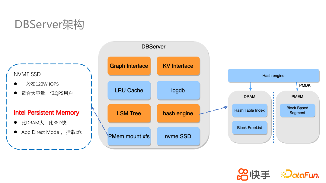 从实际业务来看,主要是 xfs 限制了 PMem 的吞吐。在挂载 xfs 时一般开启 dax 选项,导致对文件的读写需要直接落盘,这样对于文件的修改需要加锁修改文件的 meta 信息。加锁会造成瓶颈,目前仍在探索 PMem 新的使用方式。目前正在研发的是基于 PMem 的 Hash 引擎,主要的设计方案是绕过 xfs 系统,通过 PMDK 来读写 PMem。为了高效地寻址数据,把 PMem Block 的索引结构和管理 PMem 空闲空间的 free list 保存在 DRAM 当中,在引擎重启时,通过扫描 PMem 重建索引,这样 DRAM 可以快速索引数据,同时 PMem 可以高效持久化并读写数据。在引擎的上层引入 LRU Cache 来加速读。针对热点问题一般会另外架设两级 cache 架构,采用自研的 logdb记录 binlog,向外提供图接口或者 K-V 接口,由 SDK 直接访问。