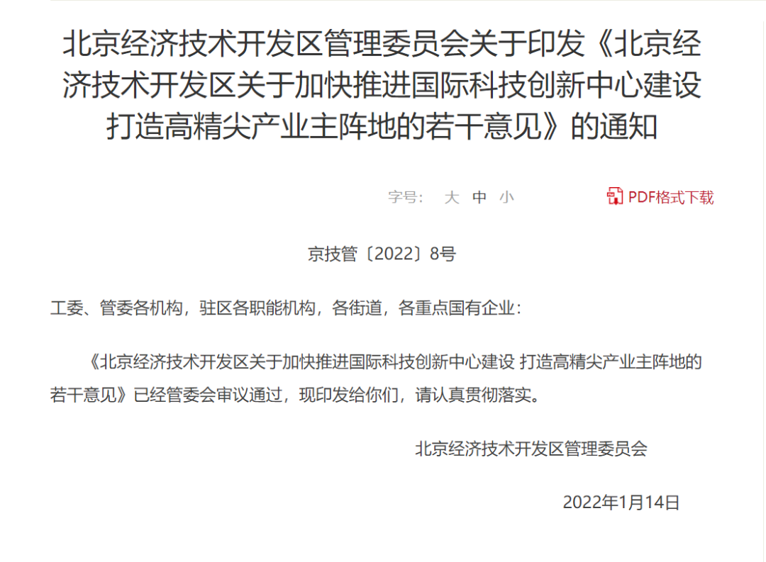 而北京市各大区域也不甘落后。作为区域政策,“科创20条”(《北京经济技术开发区关于加快推进国际科技创新中心建设打造高精尖产业主阵地的若干意见》),从五个方面出台20条具体措施,提出到2025年,以企业为主体、应用为导向的创新引导体系日益完善,创新要素加快聚集、创新能力显著提升、创新活力充分释放,科技创新对产业发展和城市建设的引领性、带动性、支撑性充分彰显,产生一批高价值知识产权成果,突破一批“卡脖子”关键核心技术,培育一批硬核创新型企业,打造国际一流创新产业生态,成为北京科技和产业创新的开路先锋。