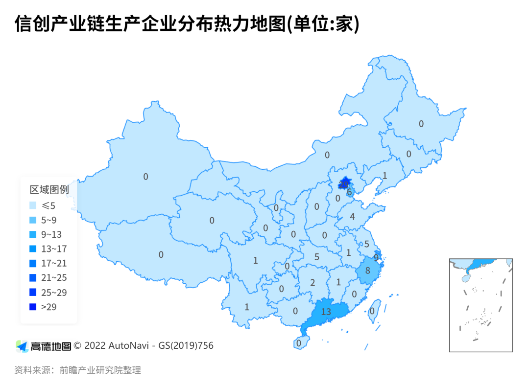 从信创产业链区域热力地图来看,也是北京市分布最多。根据前瞻统计,从信创产业代表企业地域分布情况来看,北京优越的IT产业基础为信创产业提供支持,目前北京已形成以龙芯、统信、中科方德为核心的完整的信创产业链条覆盖,其信创产业代表性企业分布共有29家;其次为广东,代表性企业分布共有13家。