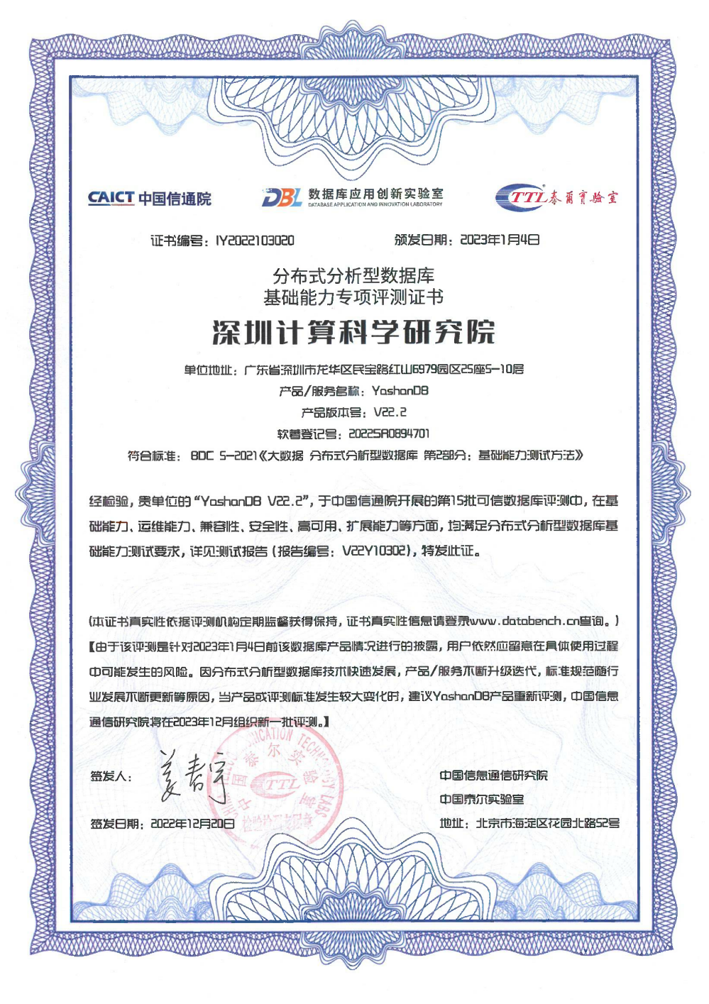 截至目前,YashanDB已顺利通过集中式事务型性能、分布式分析型数据库基础能力两项数据库领域专业评测。