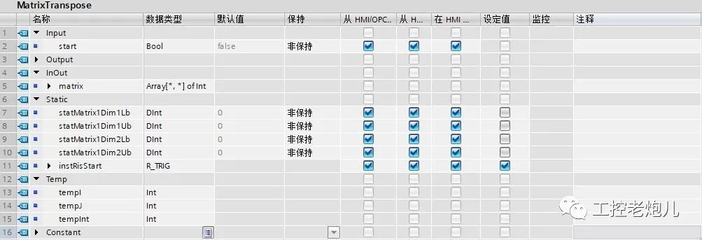 定义了变量#start,数据类型为Bool,用来作为触发转置的条件。定义了可变长(泛型或可变限值)整数类型二维数组,数据类型为#Array[*, *] of Int,用来作为矩阵的输入和转置结果的输出。