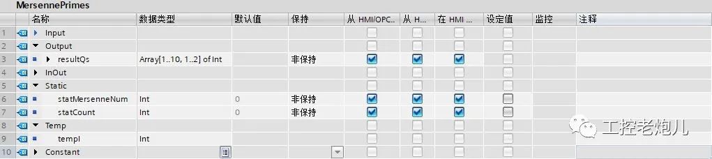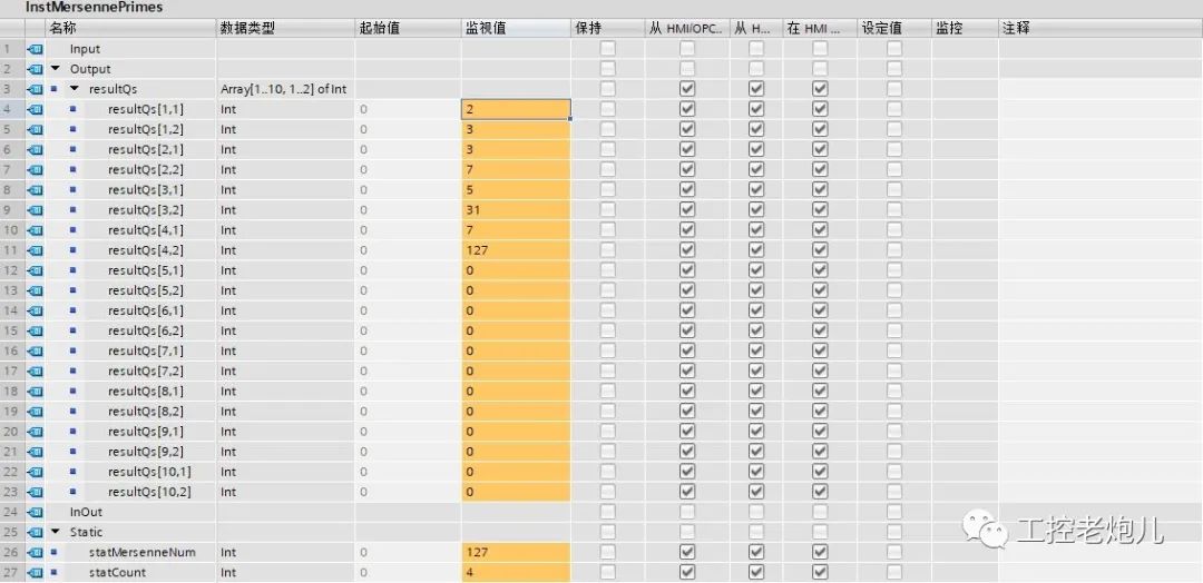 在循环OB中调用FB- “MersennePrimes”,调用时会自动创建背景数据块,命名为“InstMersennePrimes”,该背景数据块可以用来监视和修改数据。转至在线并监控程序。如下图:
