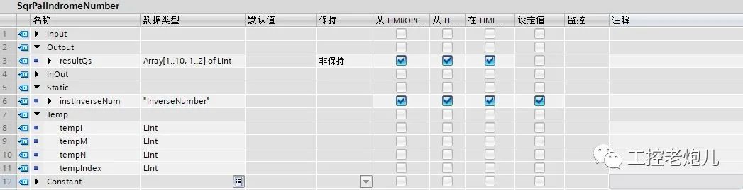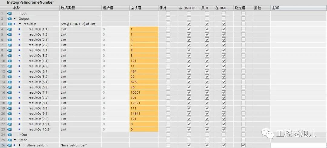 在循环OB中调用FB- “SqrPalindromeNumber”,调用时会自动创建背景数据块,命名为“InstSqrPalindromeNumber”,该背景数据块可以用来监视和修改数据。