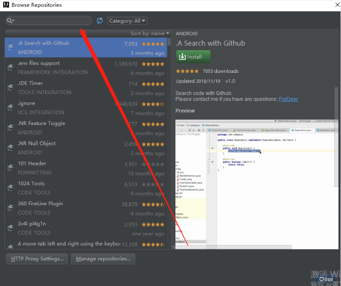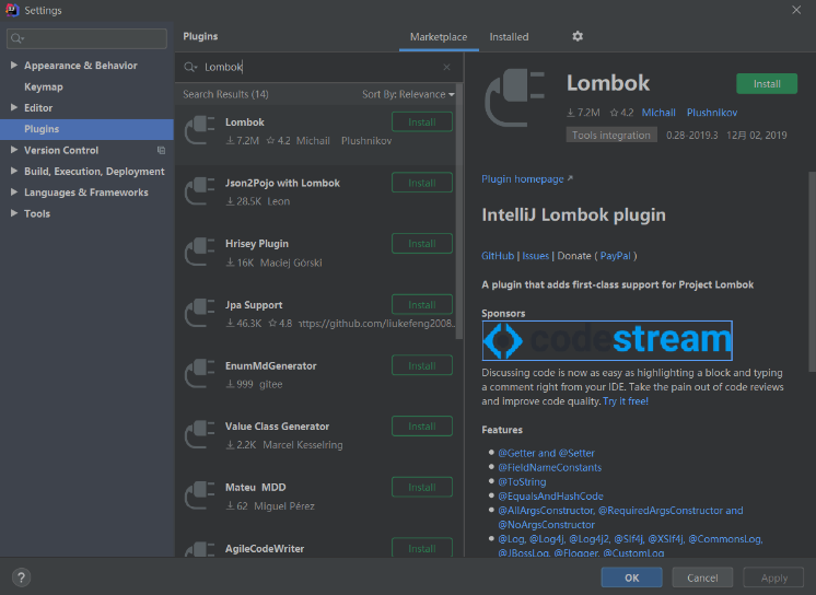 3. 输入框输入lombok进行搜索,之后点击安装,