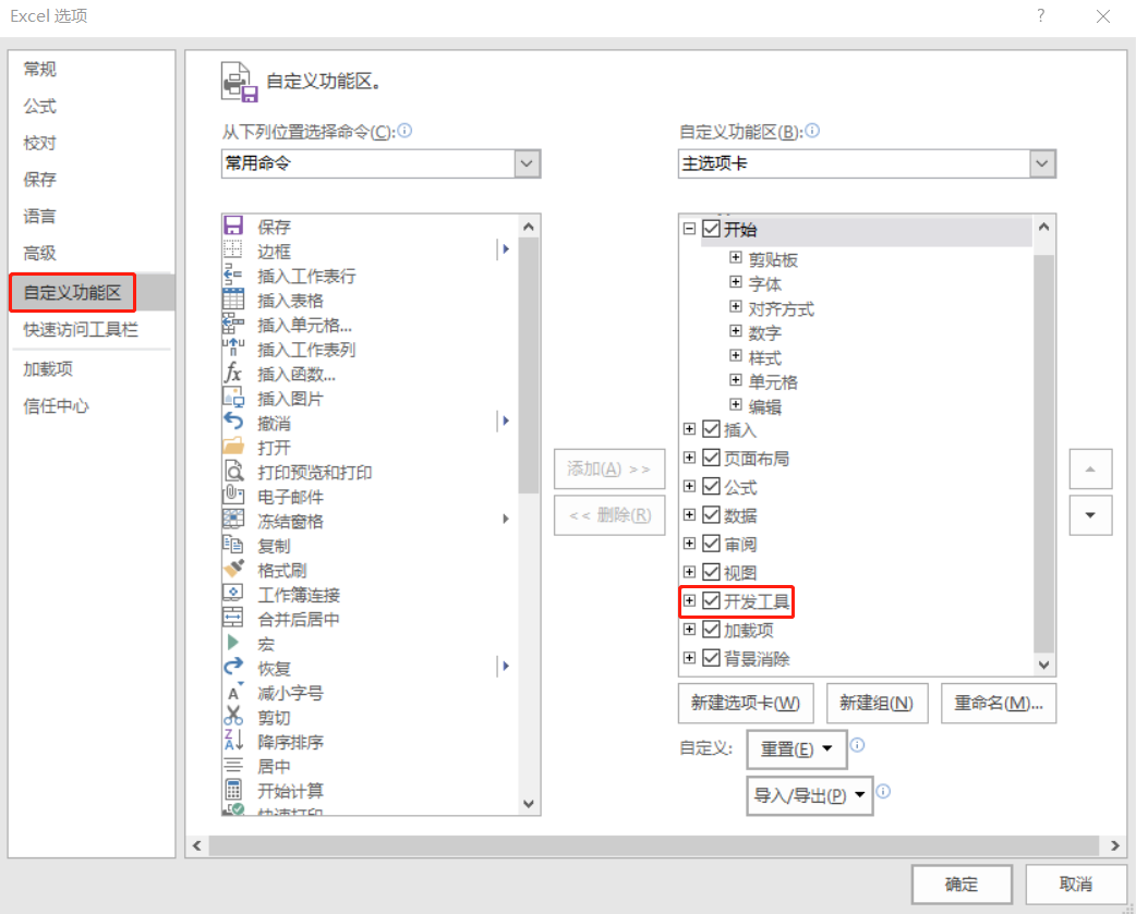 点击"自定义功能区",选中"开发工具",点击"确定",