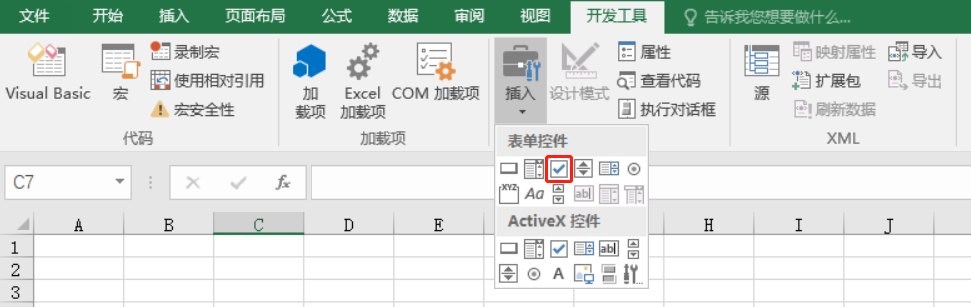 点击"开发工具 "选项卡,选择"插入",找到复选框即可使用,