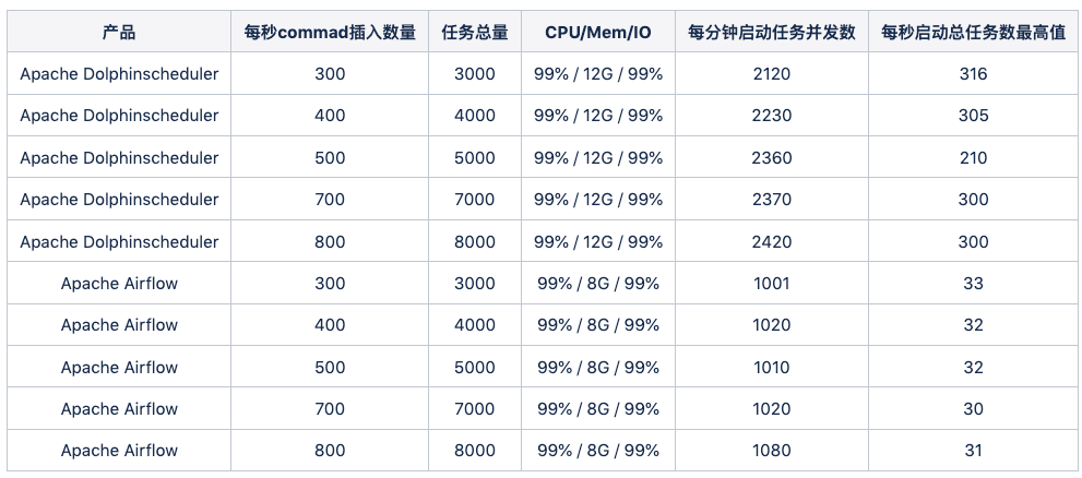 可以看出单机情况下 Apache Dolphinscheduler 和 Airflow 的 CPU 都达到接近 99%; Airflow 在不同 command 并发情况下,每分钟任务并发数(task_avg_count_start_time_per_min) 维持在 1001~1080 左右; Apache DolphinScheduler 的 task_avg_count_start_time_per_min 维持在 2120~2420 左右, 是 Airflow 的 2+ 倍。