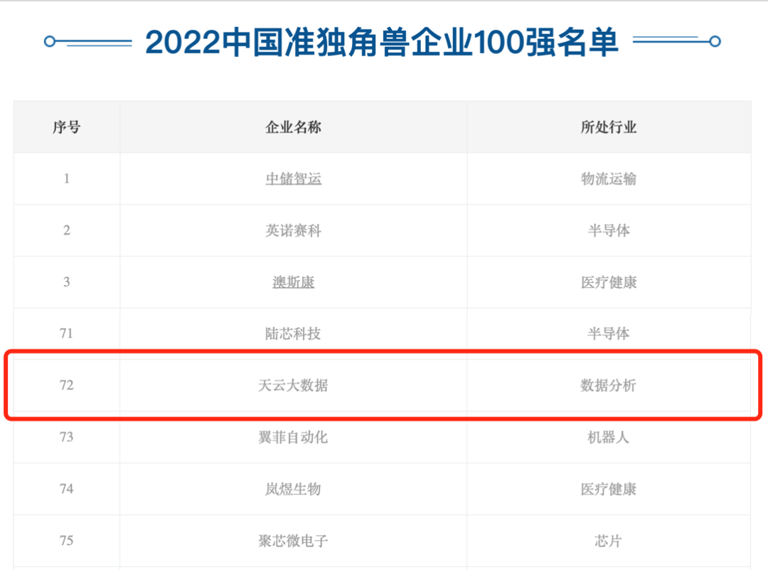 近日,天云数据凭借高成长、高潜力、领先的核心技术和创新的商业模式强势入选「2022中国准独角兽企业TOP100」榜单。该榜单由中国科学院《互联网周刊》联合德本咨询、eNet研究院共同发布。