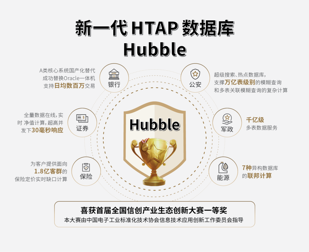 HTAP数据库Hubble实现去IOE最难的部分,在银行A类核心系统国产化成功替换Oracle一体机,1100万笔交易数据实时并发入库,TPC-DS国际化标准100%支持。