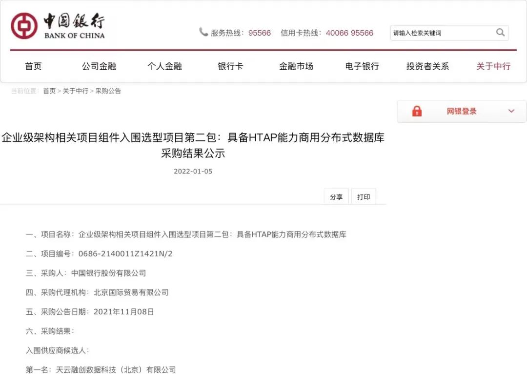 近日,国有四大银行之一中行就企业级架构相关项目组件入围选型项目第二包:具备HTAP能力商用分布式数据库进行采购。天云融创数据科技(北京)有限公司(以下简称“天云数据”)以第一名身份中标。