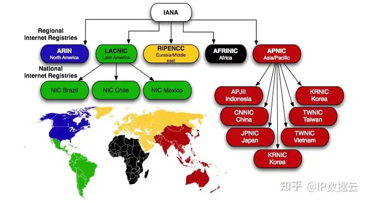 IANA(The Internet Assigned Numbers Authority)是ICANN 旗下的一个标准组织,负责 IP地址和ASN 的全球分配、DNS根区域的管理和协议分配。在IP号码管理方面,IANA 主要负责根据全球政策将未分配的 IP 块池分配给 RIR,以确保跨地区的IP地址公平分配。