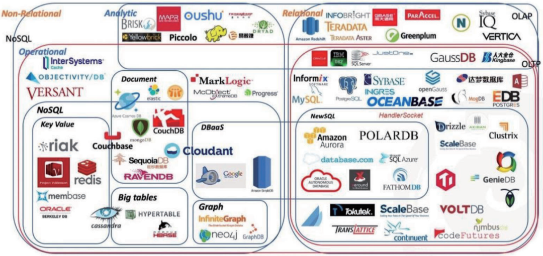 生产实践中各具特质的数据在不断推动数据库技术的发展,时至今日,从关系型到非关系型,从结构化到非结构化,从小数据到大数据,数据库正在不断扩展范畴,承载越来越重要的使命。数据库按照数据存储的形态可以分为关系型和非关系型(NoSQL为主)数据库,按照数据应用的形态又可以分为OLTP事务型和OLAP分析型数据库。随着新技术形态的引入,数据库市场又催生了云生态的DBaaS、融合SQL和NoSQL的NewSQL产品。当然,今天的数据库技术都在不断互相借鉴成长,HTAP试图提供混合事务分析处理能力,数据湖技术又尝试把所有的企业数据统一存储,也就导致很难再去对数据进行精确的归类和区分。