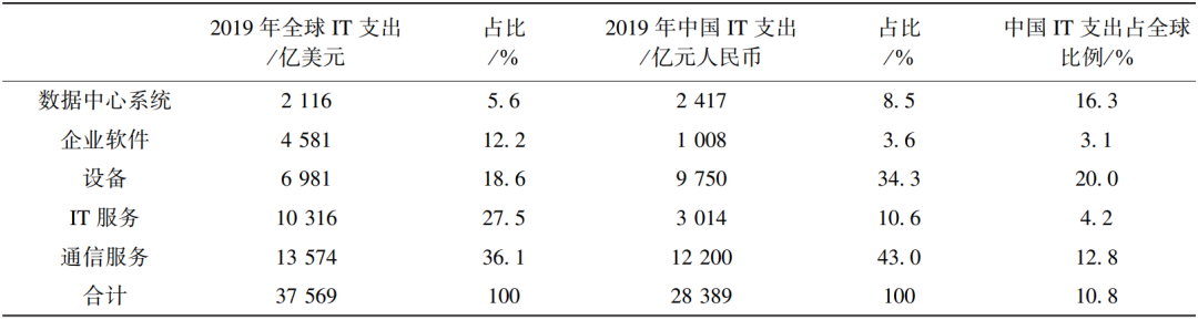 表3 2019年中国IT支出水平与全球IT支出水平的比对(数据来源:Gartner)
