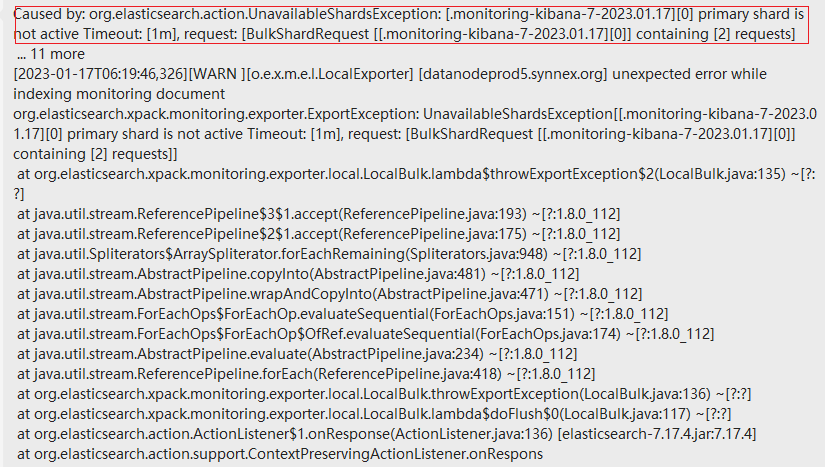 Caused by: org.elasticsearch.action.UnavailableShardsException: [.monitoring-kibana-7-2023.01.17][0] primary shard is not active Timeout: [1m], request: [BulkShardRequest [[.monitoring-kibana-7-2023.01.17][0]] containing [2] requests]