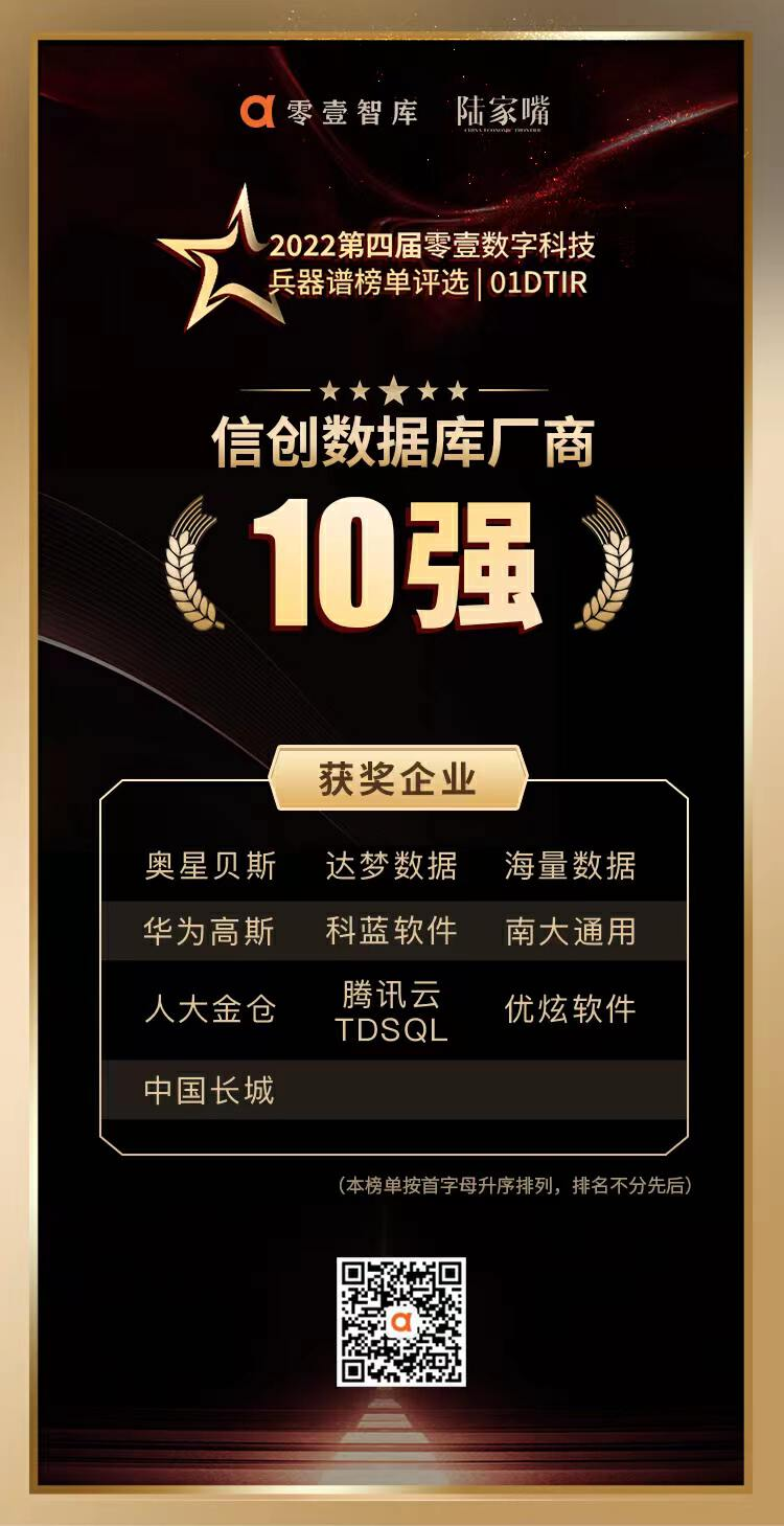 在本次峰会上,“2022第四届零壹数字科技兵器谱榜单”隆重揭晓,优炫软件入选信创数据库厂商十强。