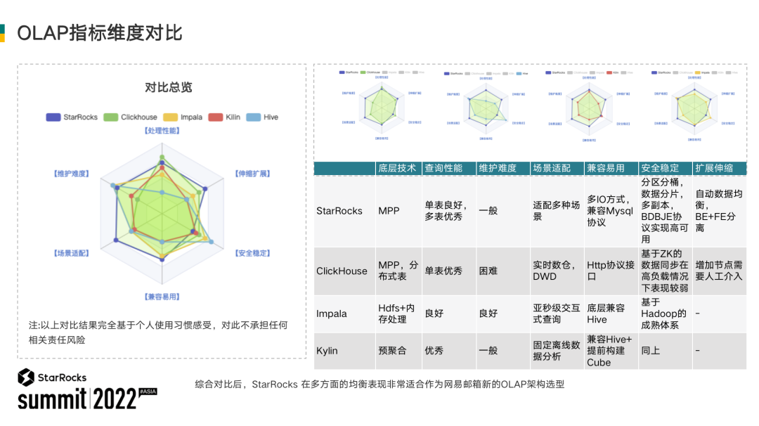 业务日志数据存储:所有业务日志都要求永久冷备存储,同时在一些关键的业务上面,要求至少有半年以上的热点数据的热备存储。不同的数据分别存储,离线数据存储到 HDFS ,实时数据存储到 ClickHouse。业务可用性保障:网易邮箱作为一个通信性质的业务,它的核心收发信链路以及用户登录验证机制对可用性要求非常高。核心指标统计:包括用户的活跃度,用户新增/流失/挽回等转化率,APP的安装率, Webmail 的登录等数据,会生成数据报表进行数据展现。运营策略指引:包括直邮、推送等的转化率的分析,以及引流用户的留存率等方面的一些数据统计。反垃圾与风控:邮箱需要具备反垃圾的能力以及风控的能力,会对用户的敏感行为做出判断,通过数据的反馈来进行捕捉,同时制定反垃圾策略。业务产品优化:邮箱的数据产品会支持一些业务的优化,包括对一些新业务的用户使用数据的采集分析,以及诸如用户支付和订阅情况的分析等。服务器方面。包括一些实体机和云上的一些虚机,总的算力超过1万核,服务器分布在华北和华东等各个 IDC 机房。数据比较分散,汇总处理的难度较高。用户量方面。网易邮箱存量的注册用户达到10亿级别,同时每天还在新增巨大的新注册用户量。存量和增量巨大,风控的压力较大。数据量方面。冷备的历史压缩数据已经达到PB级别,同时每天新增的数据量也很大,内外网的数据流量峰值达到每秒上G的级别。资源吃紧,维护成本高。业务线方面。核心的收发信数据链路和登录服务的可用性要求都是 SLA 达到 99.99%,同时每天都有超过1000个的离线数据处理任务,实时数据处理要求7×24小时无间断运行,下游支撑超过1万个数据服务。业务模型复杂,服务精度、可用性要求高。网易邮箱作为国内互联网行业里面最早接触大数据领域的互联网厂商之一,从05年就开始接触 Hadoop 架构作为大数据处理平台。当时主要功能是数据的存储和采集,使用 MapReduce 进行数据处理,使用 Hive 和 HBase 进行离线和实时数据查询任务,数据输出使用 Oracle 的 BI 系统实现。随着技术的不断发展,到18年逐渐过渡到基于 Flink + Kafka + ClickHouse 以及网易杭研自研的猛犸平台组建的一个批流合一的数据平台。ClickHouse 作为 ODS 基础数仓,主要用来支持实时性的查询任务,猛犸平台主要负责任务的编排和调度,自研的数据报表系统进行数据的呈现。随着业务深入的发展,现有的架构在一些特殊的场合或需求下,有些力不从心。包括一些跨表的或者复杂度较高的查询,以及一些高并发的场景,还有一些大数据的热点更新的场景,现有的架构都没有办法做到满意。网易邮箱从21年开始引入了 StarRocks,作为下一代数据引擎架构,解决高并发查询输出,复杂事务跨表查询,数据热更新支持等问题。网易邮箱为什么会引入 StarRocks,这要从业务痛点说起。首先,从资源方面来说,网易邮箱因为用户量和数据量都非常大,资源显得有些不足,造成 Kafka 和 ClickHouse,以及运算机器本身等,经常会出现一些因为压力过大而产生的报警,影响数据业务的开展和数据处理任务的开发。其次,因为现有架构里面会同时存在多个数据平台,每个平台都要相应的运维人员介入,造成运维成本和采购费用居高不下。再次,在数据需求方面,当前的架构与一些业务需求不匹配,主要体现在包括离线实时,和一些高并发以及跨表的查询,都没有一劳永逸的方案。同时,作为移动互联网的一个永恒不变的矛盾,产品对于数据需求的紧迫性,当前的架构没有办法很好的快速支持。另外,在数据开发方面,由于邮箱的一些历史原因,一些比较老旧的基础服务的日志,开发的时候并没有考虑到数据统计方面的需求,这些日志的格式参差不齐,对数据清洗以及下游的数据存储的技术迭代有一定影响。最后,系统的一些链路经过多年的迭代之后有些臃肿,而数据需求经常变化多端,导致开发人员的人力资源不是很够,造成开发难度的增大。因为上述问题,我们迫切需要一个性能强悍、上手容易、部署简单、使用方便、适配性高、安全稳定的 OLAP 系统,而 StarRocks 刚好能满足我们的需求,这是我们为什么要引入 StarRocks 的根本原因。我们对比了国内外一些比较常见的 OLAP 系统,包括 StarRocks、ClickHouse、Impala 以及最基础的 Kylin。下图是我们的对比结果。