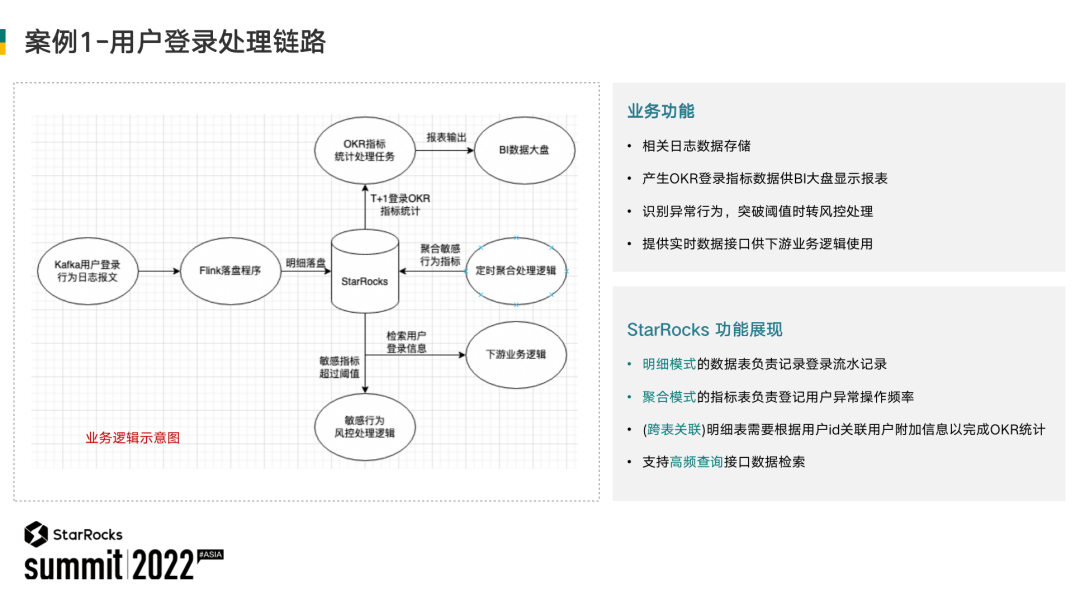 左边是数据链路的一个示意图,用户登录的行为数据,经过 Kafka 以及 Flink 的实时处理之后,存储到 StarRocks 数仓,然后同时支持下游4个不同的数据需求。数据的落盘存储。