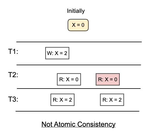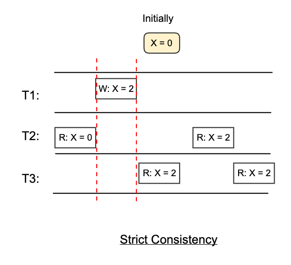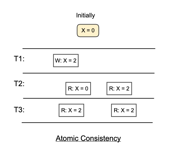 For example, in the following diagram, the read and write operations are ordered strictly by real time. The read of X from thread T2 happens before T1 writes X = 2, therefore, it receives X=0. The read of X from thread T3 happens after T1 writes X = 2, therefore, it receives X = 2.