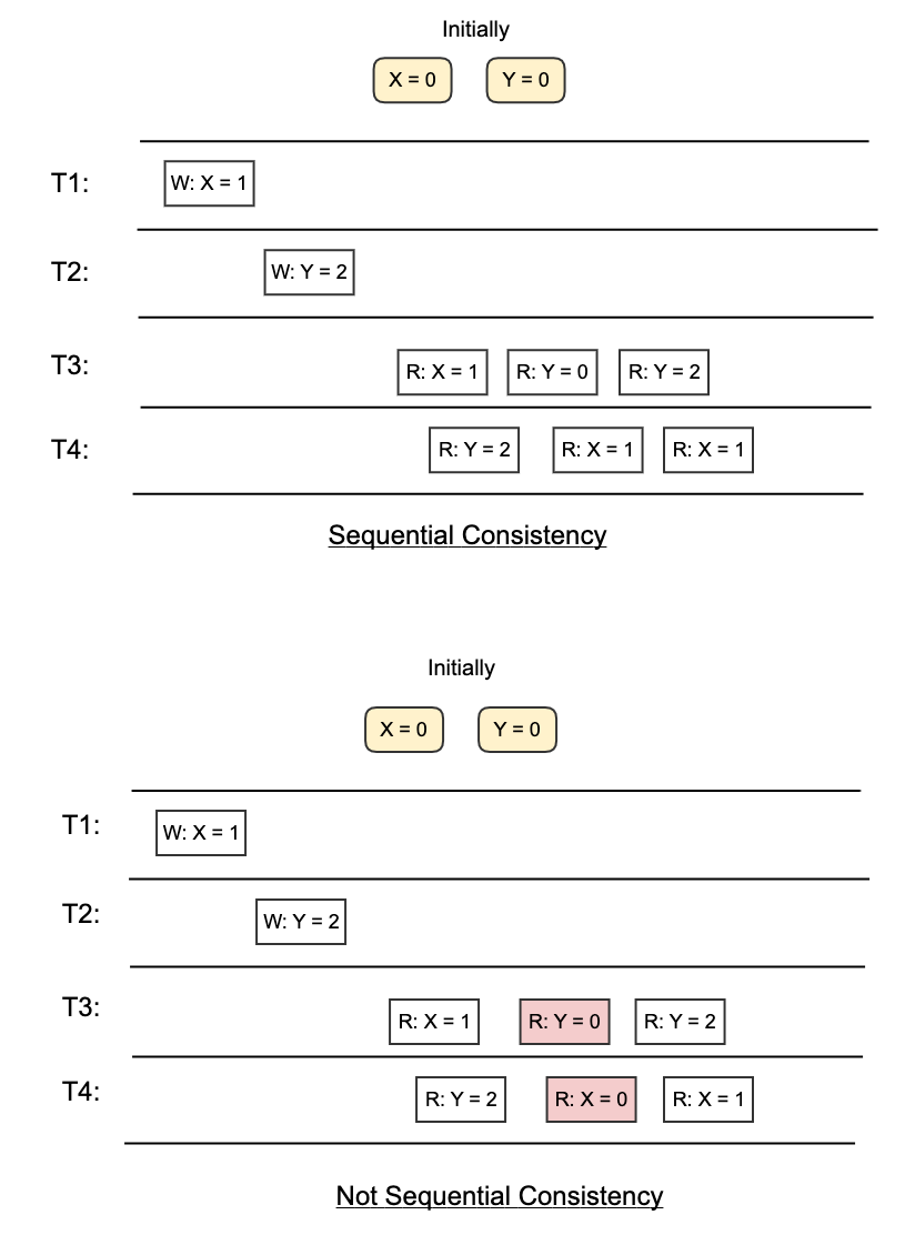 For example, in the following diagram, we can see the thread T1 write X = 1, and thread T2 write Y = 2. The Sequential Consistency doesn’t enforce that every thread must see write X = 1 before write Y = 2.