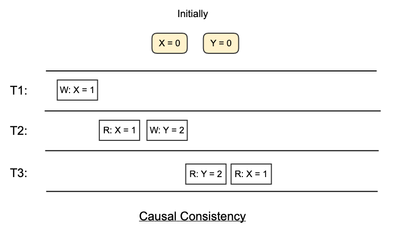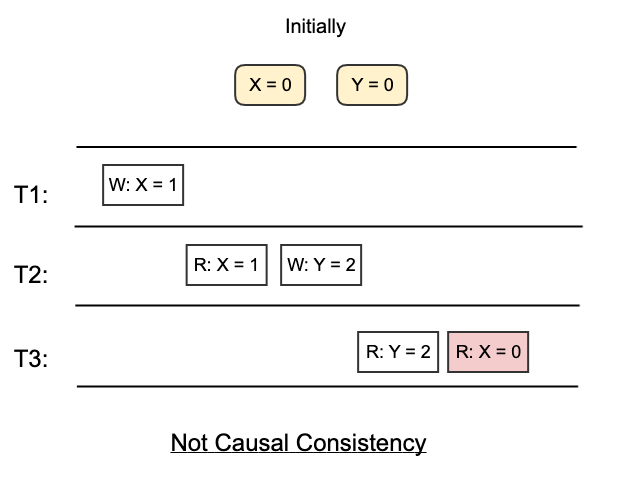 For example, in the following diagram, thread T2 reads X = 1 before writes Y = 2, then all threads that have already seen Y = 2 must see X = 1. In the second diagram, where T3 read Y = 2 first, but then read X = 0, which violates the Causal Consistency.
