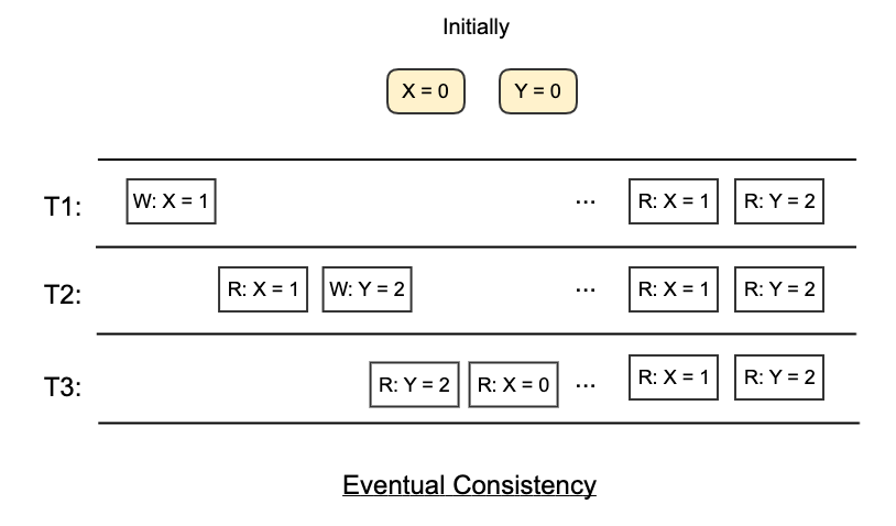 For example, in the following diagram, T3 reads X = 0 even after reading Y = 2, which violates the Causal Consistency. However, it doesn’t necessarily violate the Eventual Consistency as long as after a “long” period of time, all threads read X = 1, and read Y = 2.
