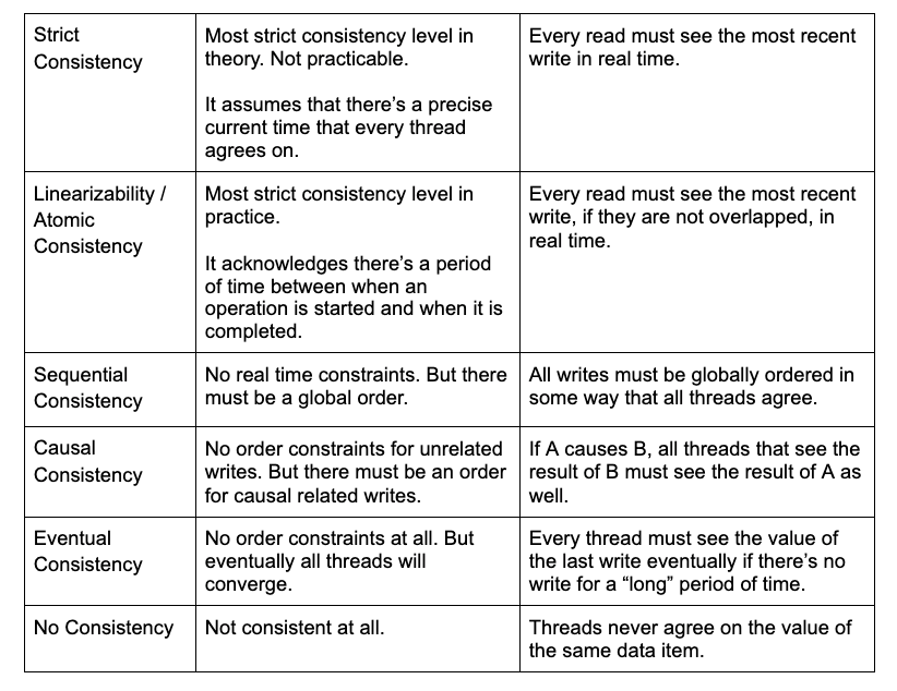 In theory, the most strict consistency level is called “Strict Consistency”. It assumes that every thread knows and agrees on the precise current time without any errors. With such assumption, all writes from all threads are sequentially ordered by the real time these writes are issued, and every read will see the most recent write in real time.