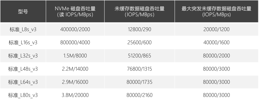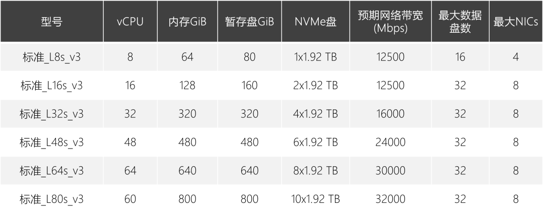 本地磁盘的高吞吐量和IOPS使得Lsv3系列VM成为Apache Cassandra和MongoDB等 NoSQL存储的理想选择。这些存储跨多个VM复制数据,以在单个VM发生故障时实现持久性和保障。Lsv3系列VM不为数据磁盘提供主机缓存,因为这不利于Lsv3本身的工作负载。Lsv3-VM的具体参数如下: