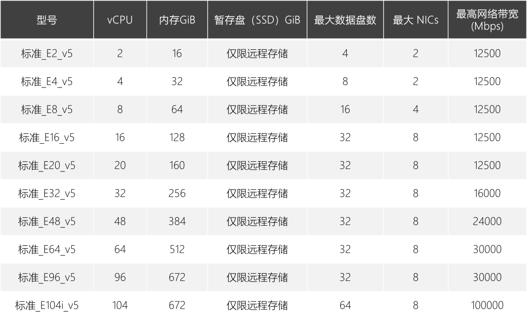 Ev5-VM系列支持标准SSD和标准HDD磁盘类型。要使用高级SSD或超级磁盘存储,请选择Esv5系列虚拟机。磁盘存储与虚拟机将分开计费。Ev5-VM 内存优化虚拟机的具体参数如下: