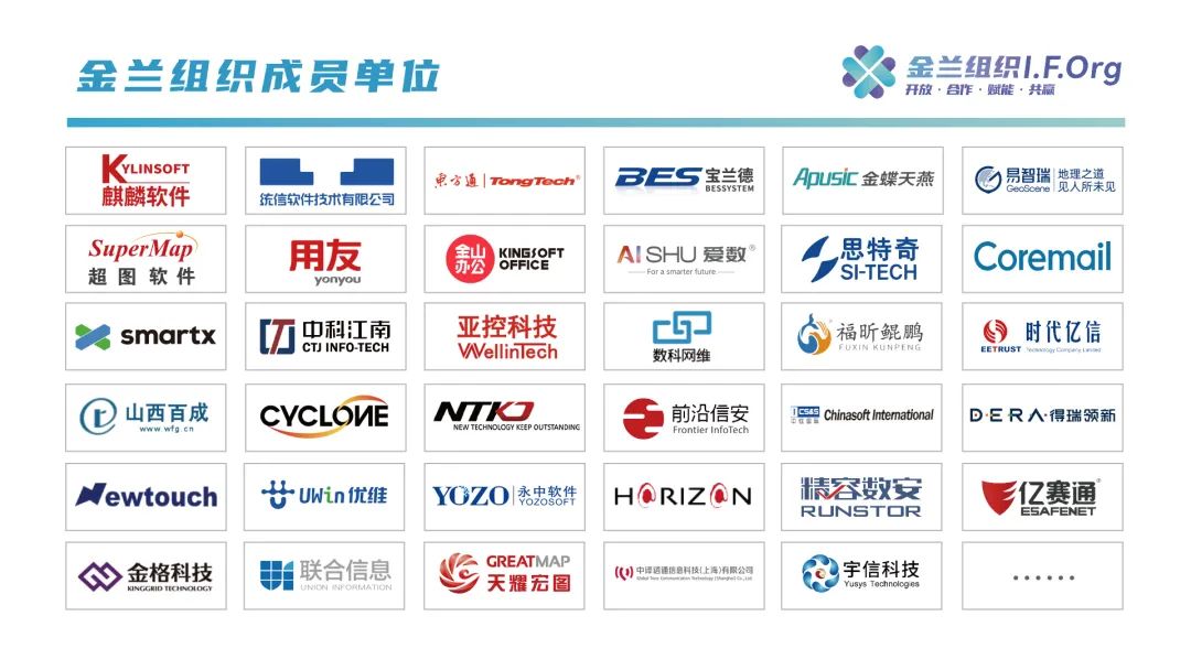 金兰组织由人大金仓发起,是联合国产基础软硬件及行业头部企业共同成立的生态合作组织,聚焦信创最新产品和解决方案,分享在各自领域的最新成果和全国经验,共同推进国产信息技术创新与应用的生态建设。该组织旨在携手产业链上下游企业、行业专家及各行业用户等,实现优势互补、资源共享、技术攻关,共同打造安全、好用、开放的产品与解决方案。在产品融合、联合营销、市场推广、人才培养等方面展开深入合作,助力国产软件和信息技术服务产业的高质量发展,共建包容、繁荣的信息技术生态系统。