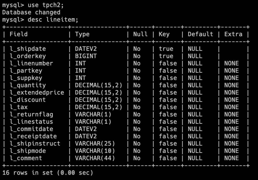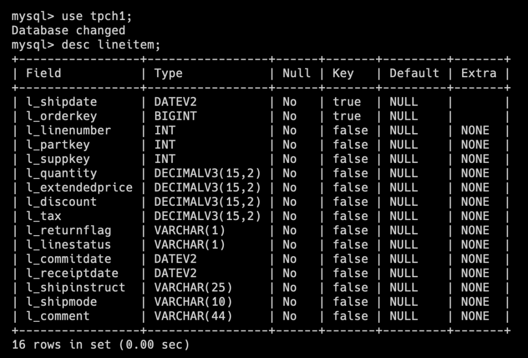 我们在两个库分别对新版 DecimalV3 和老版本 Decimal 进行建表,建表可参考:https://github.com/apache/doris/blob/master/tools/tpch-tools/ddl/create-tpch-tables.sql,建表完成如下: