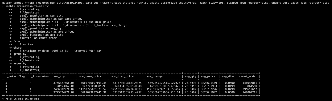 tpch1 库(DecimalV3)的 SQL 执行结果为 6.38s