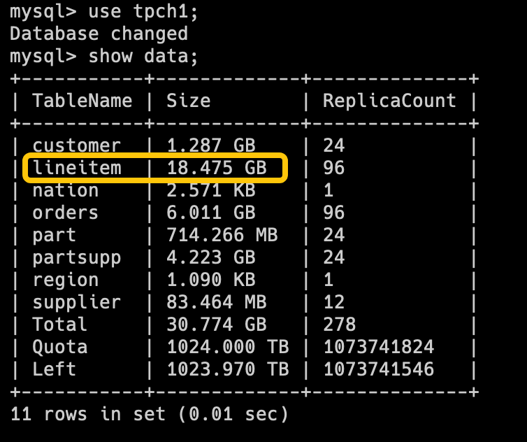 tpch1 库(DecimalV3)的 Lineitem 表的存储占用为 18.475GB