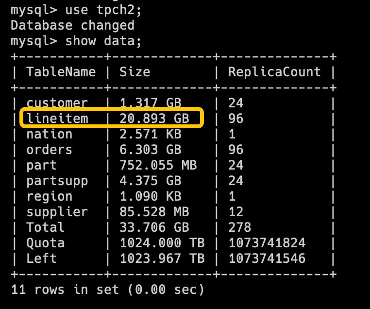 tpch2 库(老版本 Decimal)的 Lineitem 表的存储占用为 20.893GB