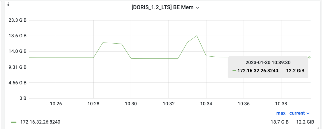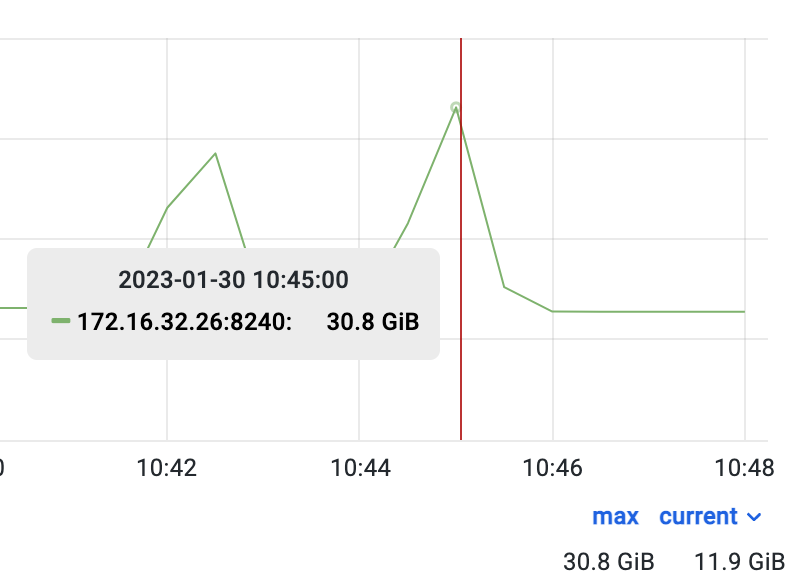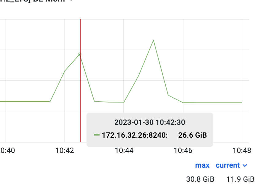 内存回落正常后,在 tpch2 库(老版本 Decimal)下执行,内存占用峰值为 30.8GB