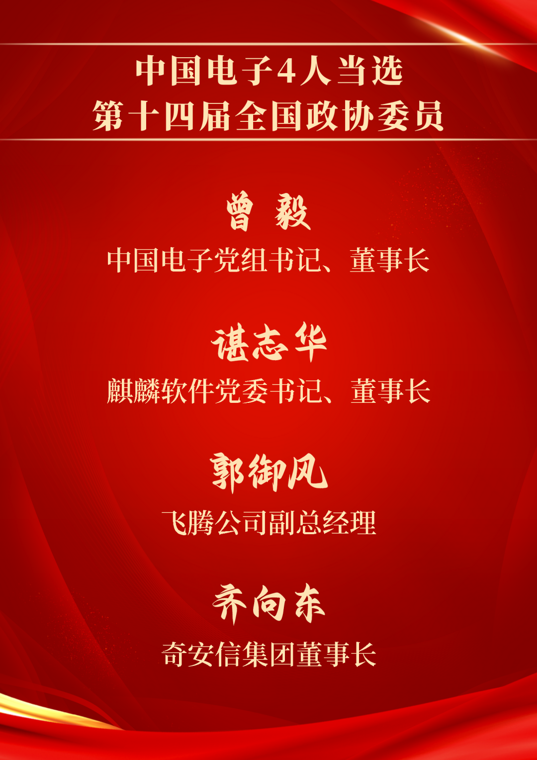 其中,中国电子4人当选第十四届全国政协委员,2人当选第十四届全国人大代表。名