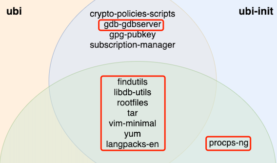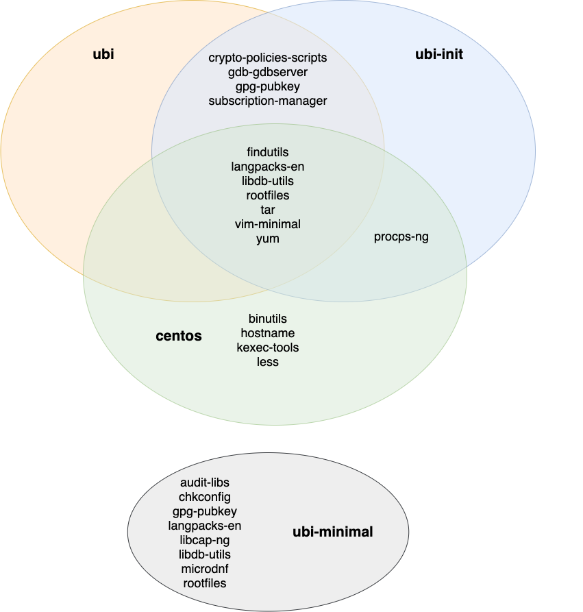 | ubi | crypto-policies-scripts, findutils, gdb-gdbserver, gpg-pubkey, langpacks-en, libdb-utils, rootfiles, subscription-manager, tar, vim-minimal, yum |