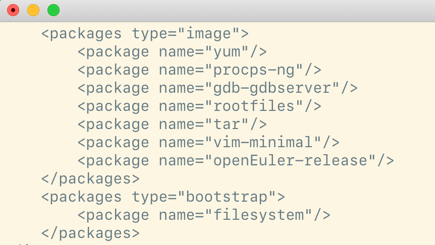 Packages type 为 bootstrap 表示在镜像准备(kiwi prepare)阶段安装 filesystem 包;Packages type 为 image 表示在镜像制作(kiwi create)阶段安装:yum、procps-ng、gdb-gdbserver、rootfiles、tar、vim-minimal、openEuler-release 包(filesystem 为 linux 基础目录结构软件包,在 openEuler 中可以通过 yum-> dnf -> bash -> filesystem 路径依赖引入,由于使用 kiwi 工具裁剪,必须提供类型为 bootstrap 的软件包,filesystem 一般作为此类型的软件包优先安装)。