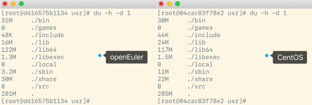我们注意到 x86_64 架构下,openEuler 21.03 版本基础镜像大小为 203MB,包含 129 个软件包;而 CentOS8 基础镜像为 209MB,包含 172 个软件包。大小几乎相同,但是软件包的数量却有较大的差异,openEuler 基础镜像“大”在了哪里?我们进入镜像里面深入的看一下。对比运行基础镜像容器: