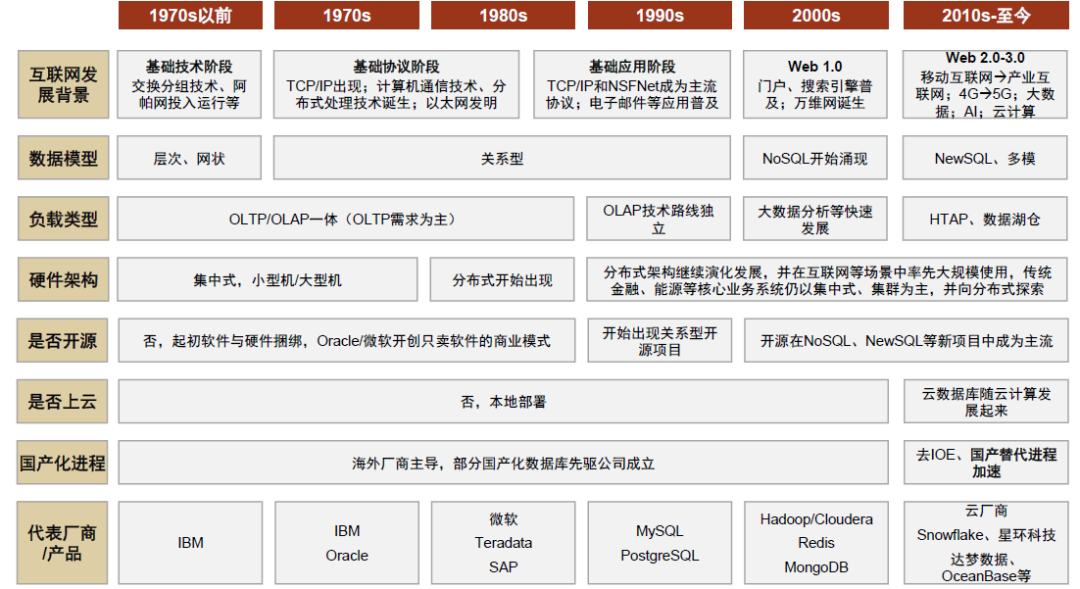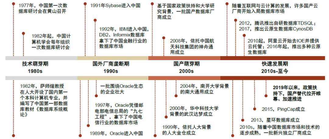 我国数据库发展从错过到追赶并向自主创新迈进,国产替代带来历史性机遇。我国的数据库技术学术研究起步于1980年前后,1988年达梦数据创始人冯裕才教授带领开发出第一个国产自主版权的数据库原型产品。1990s海外数据库厂商纷纷进入中国,彼时我国数据库产品技术仍处于起步积累阶段,商业化进程尚未开始,海外厂商迅速占领绝大多数市场份额。2000年前后,在国家重大科研项目及政策扶持之下,第一批多为依托学校背景的数据库商业公司成立,产学研结合加大投入进行技术攻关。2010s以来,在我国数字化转型逐步深入叠加技术发展带来新机遇等综合背景下,云厂商入局、一批新兴独立数据库厂商成立,国产数据库市场加速发展;特别的,自2019年以来,叠加外部环境变化,我国基础软硬件国产替代进程正式拉开帷幕,给国产数据库厂商发展增添强大助力。