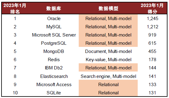 借鉴海外市场,关系模型在产品数量和流行度上依然稳居榜首。根据DB-engines截至2023年初的数据,从流行度上看,排名前10中有7个均为关系型数据库,同时排名前4的产品分别为2个商业关系型数据库和2个开源关系型数据库龙头代表,其中Oracle作为全球首个推出商用关系模型数据库产品的厂家,其产品在技术流行度排行榜上已连续十余年位居首位且得分遥遥领先。从数量上看,关系模型也是厂家最常采用的数据模型。正如我们在《数智中国之二:数据库商业市场五问五答》讨论的,我们认为关系模型经典的二维表结构,依然普适于金融、能源等行业价值量较高的核心业务数据,而互联网等发展带来的大量非结构化数据作为补充也能够为企业业务决策带来增量价值,因此我们观察到头部关系型产品亦呈现出兼容其他数据模型、向多模方向发展的趋势。