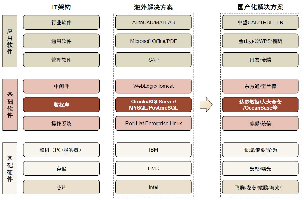 国产化是我国IT基础产业中长期发展的确定性趋势,数据库是其中关键一环。正如我们在报告《泛国产化中场回顾:承上启下,蓄势待发》中讨论的,经多年准备蓄势叠加近年外部客观环境变化驱动,我国在2019年正式启动初具规模化的国产替代进程,我们认为该趋势将在中长期持续。而数据库作为三大基础软件之一,技术及研发壁垒较高且对IT系统整体稳定性、可靠性有重要影响,是国产替代中的重要一环。