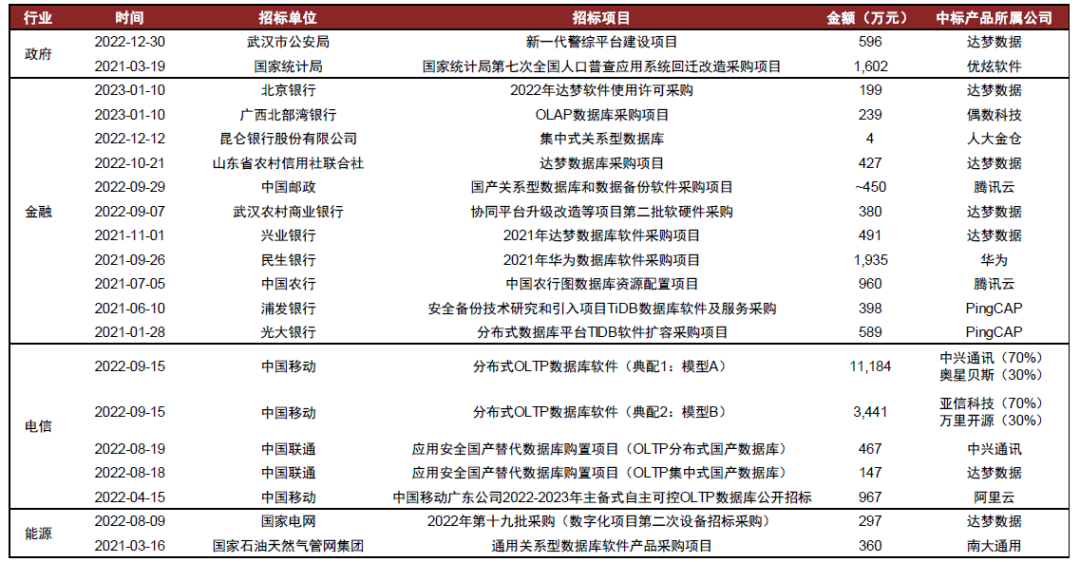 政策引导下,国产替代加速向关键行业国央企渗透,场景打磨助力国产数据库可用性提升。国企、央企是我国重要产业发展的中坚力量,尤其是金融、电信、能源等关键行业,复杂的部署场景、大规模的数据量给了国产基础软件很好的实践迭代环境。同时国企、央企一般IT投入大、建设水平高,有利于进一步提高数据库产业的创新效率。目前,国产替代已从政府端逐步往行业端渗透,我们观察到公开渠道中已经可见较多国产数据库中标项目,其中不乏千万元以上的大单。我们认为,关键应用场景下的打磨有助于国产数据库厂商持续精进产品,同时通过打造标杆客户案例也利于国产基础软件厂商的进一步商业拓展,形成“以用促研、以研保用”的正向飞轮。
