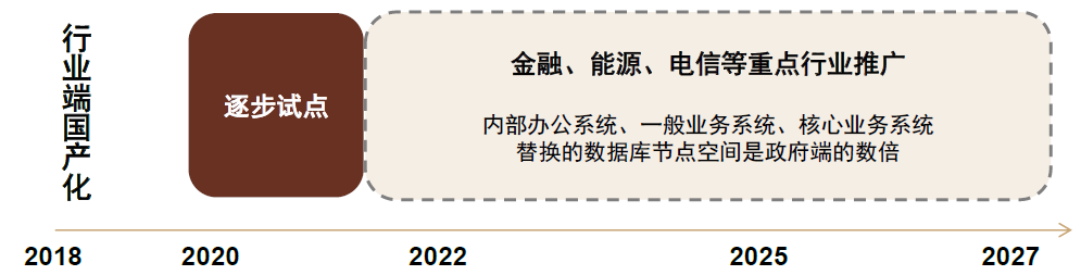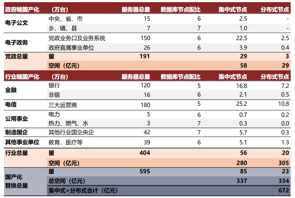 规模展望:向业务系统渗透,空间数倍于政府端。从覆盖人群角度,即使仅考虑行业国产化进度较快的金融、能源、通信、冶金等行业,短期优先覆盖的办公人群数量亦远高于政府端。而在系统层面,我们认为行业端国产化将层层递进,遵循先边缘再核心的逻辑,例如先替换内部办公系统,再逐步替换经营管理、生产等一般业务系统,并最终向核心业务系统渗透。在产品选型上,内部办公系统及一般业务系统替换仍以集中式数据库产品为主,核心业务系统将出现集中式与分布式架构并存的格局。同时根据我们的测算,行业端国产化所需的数据库节点数量将数倍于政府端。
