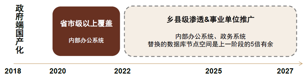 未来展望:进一步向乡县、政务系统渗透。我们认为在取得阶段性成果之后,政府端国产化将会继续向乡县级以及事业单位层面渗透,在替换系统和产品选型上,我们认为,乡县下沉的内部办公系统替换仍将以集中式产品为主,而部分业务系统及事业单位层面的政务系统将可能有分布式架构替换的需求,根据我们的测算,未来替换的数据库节点空间有望是上一阶段的5倍有余。在选型方面,政务端仍侧重对资质、产品与服务的考核。