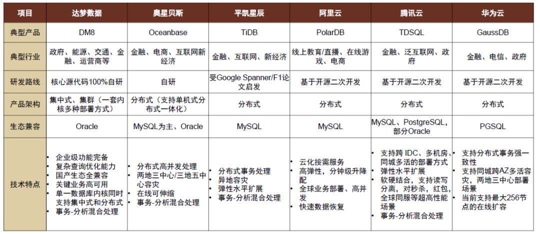 资料来源:达梦数据招股书,达梦数据、OceanBase、PingCAP、阿里云、腾讯云、华为云官网,CSDN,中金公司研究部