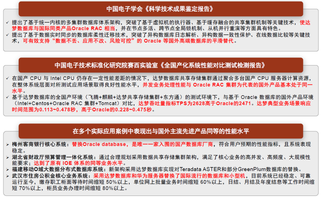 图表17:DM8技术领先性得到三方评测机构和下游客户的认可,能够实现对Oracle的平滑替换