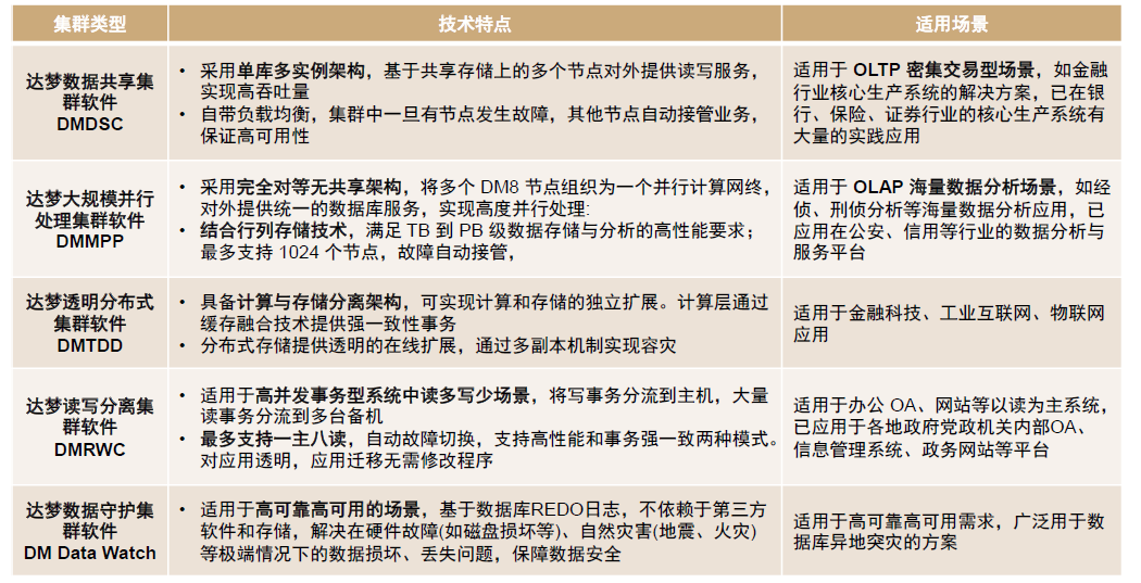 基于统一内核的多集群架构,通过一套数据库多样化配置满足不同场景需求。达梦数据库集群软件是达梦数据在市场需求引导下的又一重要原创技术突破成果,其基于统一的达梦数据库内核,通过不同的系统“拼接”方式,提供包括数据共享集群、读写分离集群、数据守护集群、MPP集群等在内的多种数据库集群形态,以满足不同的应用场景。其中共享存储集群对标Oracle RAC,在国产厂商中率先实现商业化。共享存储集群是关系数据库领域的技术“皇冠”,达梦数据持续攻关十余年,依靠自研原始创新实现了共享存储集群技术国产厂商零的突破,并已有商业化案例。